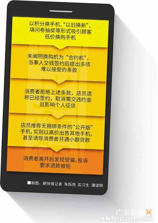 本想“以旧换新”购买一台新手机,谁知店员却在付款后“套路”不断,最终吓得消费者转而用高价购买不知名手机。1月19日,新快报独家曝光了无良手机店的坑人套路。然而,这远不是最恶劣的手法。记者接获的多宗投诉称,一些手机店打着“帮忙投票”、“积分免费换”等旗号在路边四处拉人,随后步步设套诱使消费者高价购买其劣质手机,甚至诱导或强行为消费者开通小额贷款。