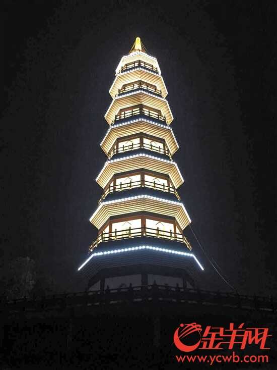 金羊网讯记者张闻、通讯员杨慧婷摄影报道:1月28日晚,佛山石湾宝峰塔亮灯仪式在南风古灶龙窑广场举行。宝峰塔是大雾岗(也叫“大帽岗”)山上的一颗历史遗珠,曾在清代被损毁,其塔基遗址2016年被发现。2017年初,宝峰塔重建工程奠基,10月塔体封顶。