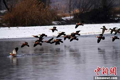 资料图:甘肃张掖黑河两岸数九寒天风光旖旎,黄鸭在黑河水中翩跹起舞。陈礼 摄