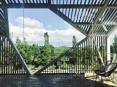 临河而建,一栋五层的老式房屋每一层都打通了房间的界限进行全新改造,二楼和一楼间有一个长长的滑梯,二楼有孩子最爱的白色波波池以及蹦床,三楼还有一个阅读室,接着往上,四楼的露台,设计师说:“我还要改造出一个小型的赛车车道供孩子们游玩。”
