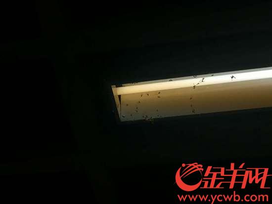 不仅是小区,就连地铁站也难幸免,3日车陂南地铁站,在近A出口的通道内,数百只白蚁在灯柱下纷飞,有灯柱附近被蜘蛛结了网,白蚁更是在蛛网上挂得密密麻麻。地铁站安检人员告诉记者,临近傍晚大雨过后,白蚁组团如狂风过境冲进地铁站,“从没有见过这么多的白蚁,也不知道从哪儿来。”