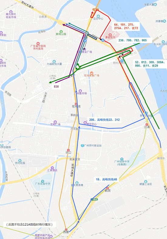 此外,芳村大道东往西行车辆还可由芳村大道左转进入花蕾路绕行花地大道或东漖北路避开施工围蔽区域,也可由芳村大道右转信义路绕行长堤街转上涌直街掉头进芳村隧道或上市路避开施工围蔽区域。而公交线路也将发生调整,其中,东往西行公交芳村站将临时停用,22条公交线路将实施绕行调整;芳村码头总站将临时迁移至洲头咀隧道上方。