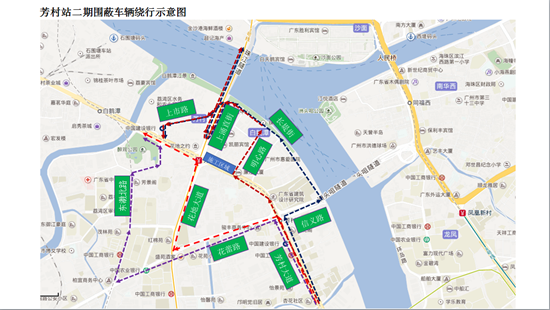 记者了解到,芳村大道中的花地大道北至明心路段实施围蔽后,将在围蔽南侧设置西往东行单向3车道的疏解道,在疏解道南北侧均设置一条约2米宽的人行道。而途经该路段的东往西行车辆则需提前绕行。施工期间,将调整芳村大道中至花地大道北东往西行路口、芳村大道中至明心路路口、芳村大道东至浣花路路口、花蕾路至长堤街等路段的交通组织模式。
