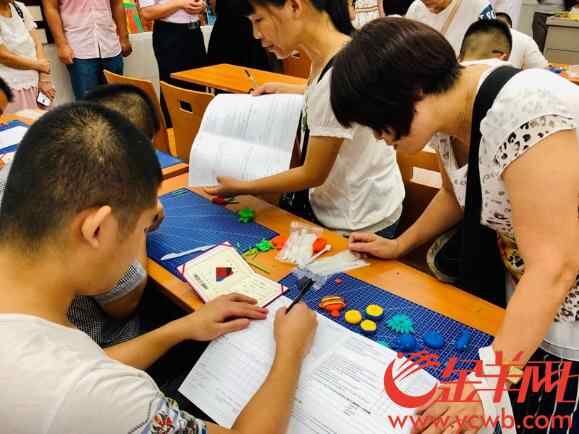 当记者跟随着政府、企业、校方走进海珠工艺美术职业学校教室时,所看见的是9名学生安安静静坐在桌子前,细心且耐心地做着轻粘土作品。在他们的巧手之下,色彩斑斓的小丑鱼、海草、胡萝卜、汉堡纷纷出现。教室墙上也挂满了出自他们之手的精美的画作。看到人来了,他们怯怯地打了声招呼,又继续投入到作品制作中。广州南丰朗豪酒店相关负责人先是观察9名学生的情况,而后派发职位申请表让他们填写。