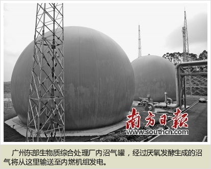 “每天将有来自广州中心六区的1000吨粪便、1000吨餐厨垃圾和全市40吨动物固废在这里进行生化处理。通过对餐饮垃圾二级分选、厨余垃圾高压压榨、动物固废高温灭菌脱水、粪便絮凝脱水,四者混合调浆附以超级厌氧微生物处理,产生的沼气每年可发电约8800万度,生产工业用油约1.5万吨。”广州东部生物质综合处理厂技术总工曹永建介绍,采用“预处理+厌氧发酵产沼气+资源化综合利用”处理技术,进厂垃圾能真正实现彻底无害化处理和高效资源化利用。