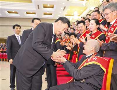 “你都做到了。你是全党全国人民的楷模!保重身体,健康长寿。”习近平总书记俯下身,双手紧握住老人的手,深情地说。全场掌声雷动。