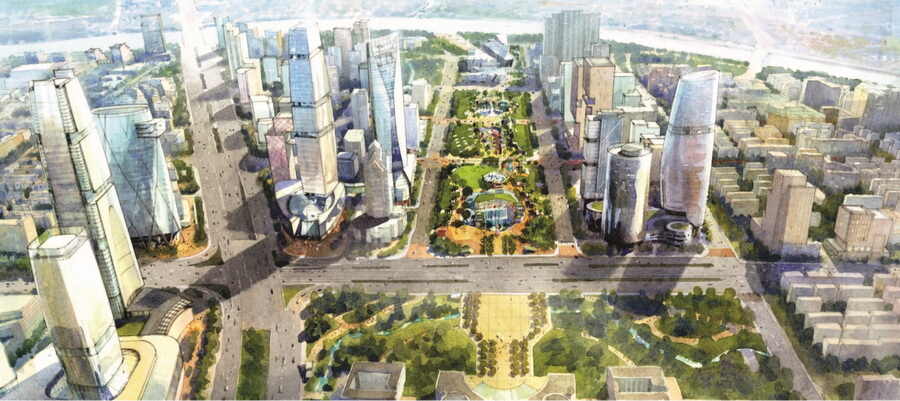 高度控制方面,按照“营造高度识别性门户地标形象、严控中轴线的建筑高度,营造中轴‘大公园’”的原则,紧邻轨道站点地标高度为240~260米,周边建筑高度为100~150米,核心区公共服务设施高度控制为6米。