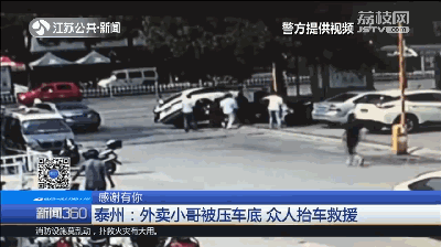 •江苏泰州一名外卖小哥遭遇车祸被卷入车底,10多位路过的好心人合力将车抬起救出小哥,整个过程不到30秒。