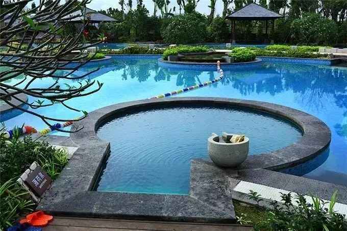 该度假村主打咸水矿温泉,园林式的自然布局,曲径通幽,果树婆娑,塑石飞瀑,亭台水榭,50多个温泉泡池仿佛翡翠,星星点点,闪烁其间,古朴与浪漫兼具,让你在休闲时收获视觉享受。