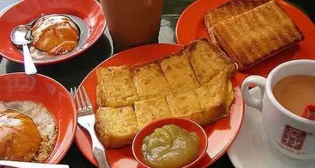 29、kaya酱吐司 Kaya是一种用椰汁、椰浆、鸡蛋、牛油和一些香料做成的甜酱料,也叫蛋椰酱,有浓浓的椰子味。大马人吃早餐时,喜欢将它厚厚地涂在烤面包或马来鸡蛋糕上吃。