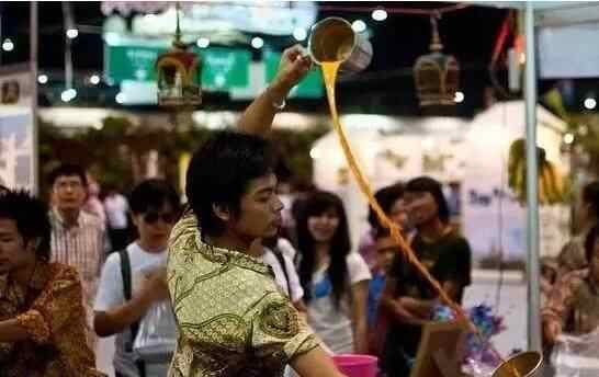 34、马来拉茶 拉茶是大马人的独创,红茶中放入牛奶或者炼乳,用两个杯子倒来倒去,有的会距离1米多远来回拉,很有表演气氛。这样做主要是为了让红茶和奶充分融合,而且能打出细腻丰富的泡沫。
