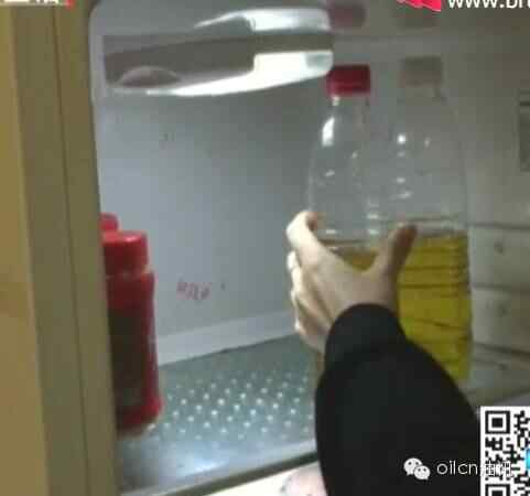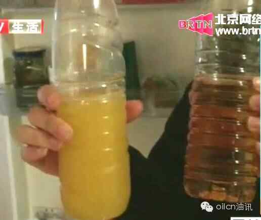 记者在超市随机购买了两桶花生油,分别取样放进冰箱里。经过24小时,一瓶油凝固成了黄色固体,而另一瓶油没有变化,依然是液态。