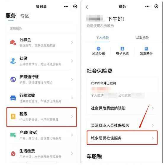 在小程序首页点击“税务”服务,在个人税务版块找到“社会保险费”——“城乡居民社保服务”,点击“城乡居民社保服务”。