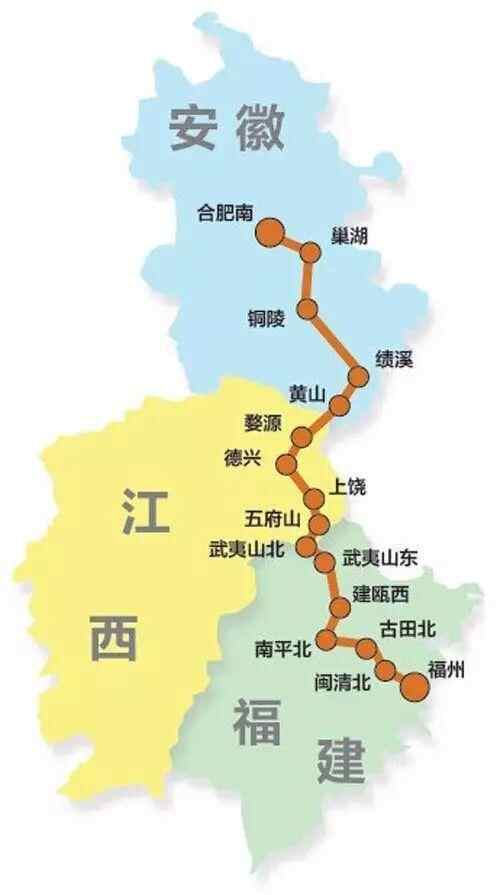 安徽段途径合肥南、巢湖东、南陵、铜陵北、旌德、绩溪北、歙县北、黄山北共11个站。