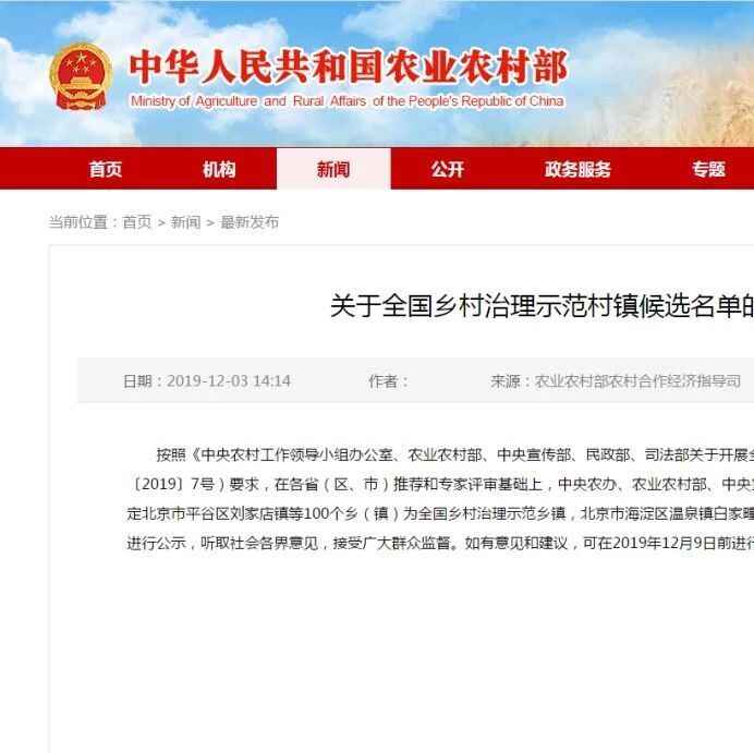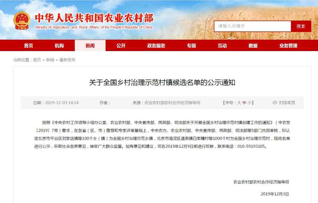 《关于全国乡村治理示范村镇候选名单的公示通知》