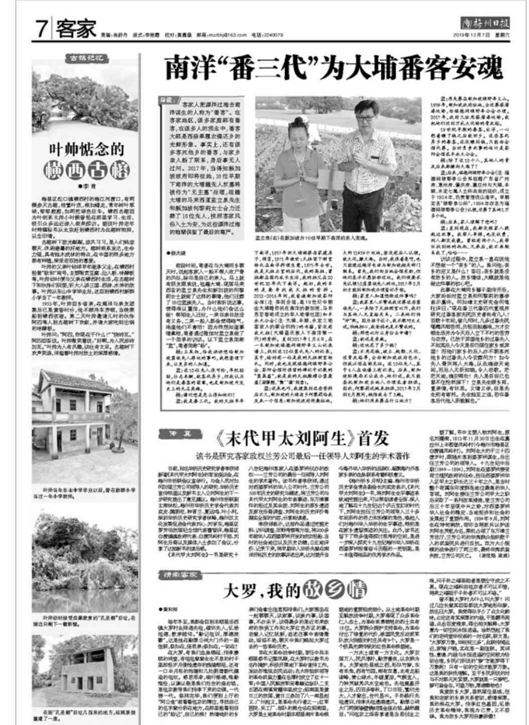 蓝:我是番三代。我的天祖早年下南洋,1857年回大埔湖寮老家建房子、捐官,1871年逝世;天祖留下侧室杨氏在南洋料理生意,1875年去世。我是天祖正室的后代,我的高祖、曾祖都在国内成长生活,我的祖父在20世纪20年代下南洋。起初,我的目的是要寻找我天祖的资料。2012-2016年间,我查遍新加坡茶阳会馆(注:茶阳会馆,是19世纪中期由大埔籍侨民在南洋的新加坡、马来西亚等地成立的华人地缘社团)和丰永大公会(注:大埔、丰顺、永定三地客家人的联合机构)的书籍,皆没有我天祖(大埔蓝氏族人下南洋第一代)的资料。直到2017年1月6日,在一本新加坡福德祠绿野亭义山记录谱上,找到这10位蓝氏先人的记录,其中,恰好有一位是我的天祖侧室杨氏。同时,我也发现福德祠绿野亭公会、茶阳会馆所保留的碑记中记载的“蓝集盛”,就是我的天祖殿穆公蓝袭盛(湖寮腔,“集”“袭”同音)。