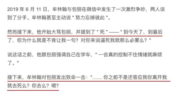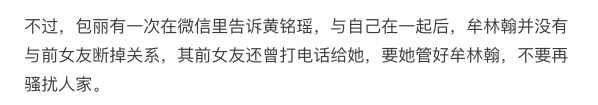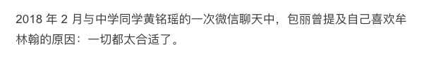 2018年,包丽参加学生会主席竞选,牟林翰一直在背后,为其出谋划策。后来,包丽竞选虽落了榜。但与牟林翰却走到了一起。牟林翰是包丽第三任男友。