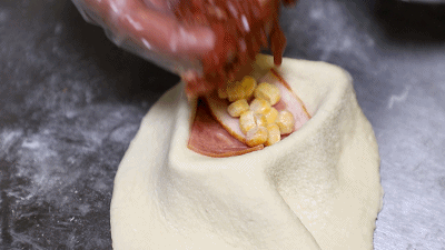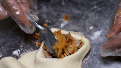 精心选用优质面粉经手工和机器的反复碾压,让粿皮更薄,口感更软糯!碾好的粿皮放进三角粿模具中,填进满满的馅料再包好脱模!