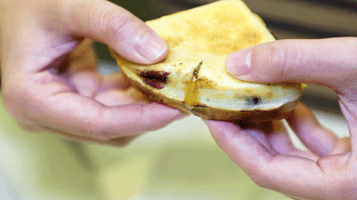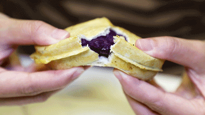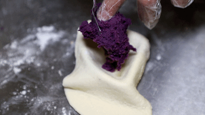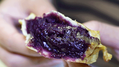 趁着三角粿刚出炉还热气腾腾的时候,轻轻撕开,流心便迫不及待都溢了出来,紫薯的甜蜜和蛋黄的咸香相互交织,尝一口就忘不了它的美味!
