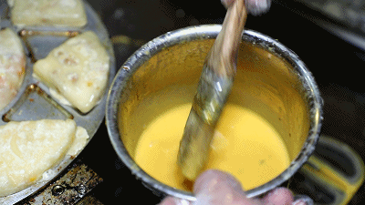 包好的三角粿就可以上锅烤制啦,仔细刷上一层蛋液也是让粿皮更加香软的秘密!值得一提的是,这口铁炉还是赤将军家特别定制的哦!