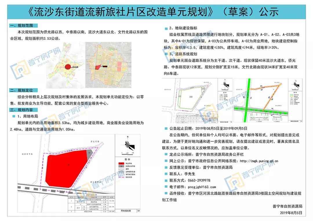 ❂ 8月5日,《流沙东街道流新旅社片区改造单元规划》(草案)公示,规划面积约52.95亩,定位为:以零售、批发商业为主导功能,配套公寓的复合型商业服务中心。