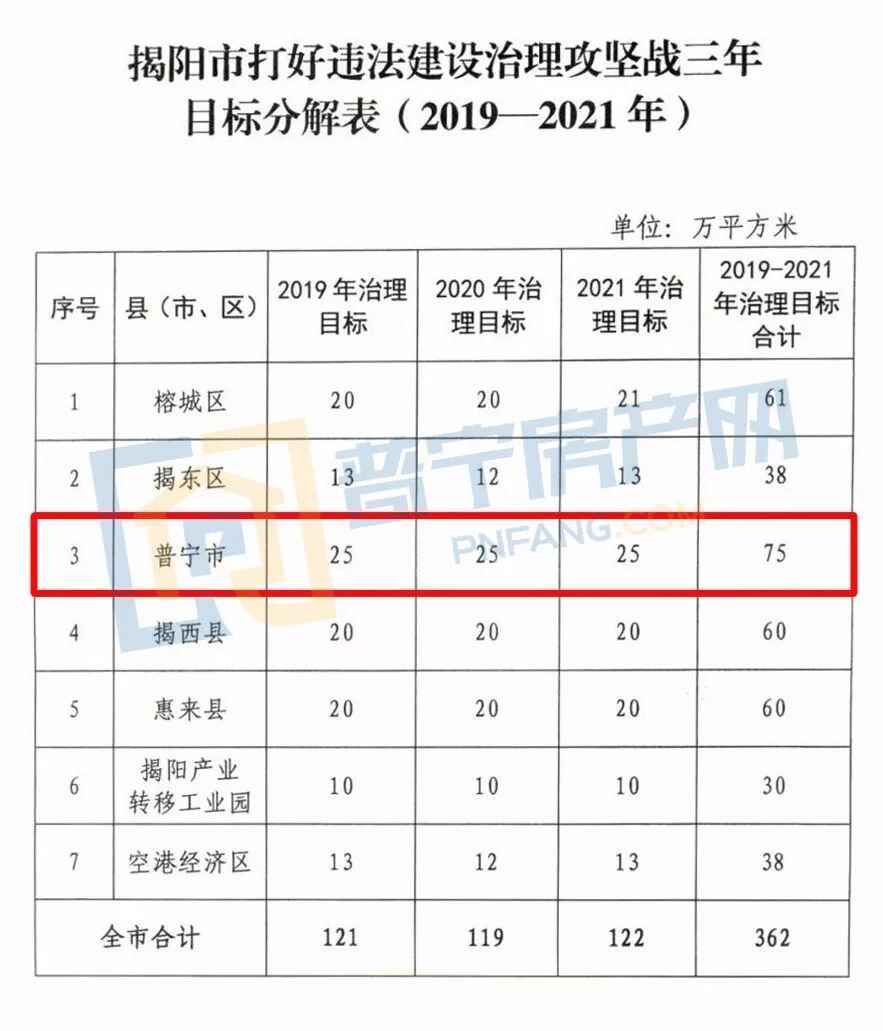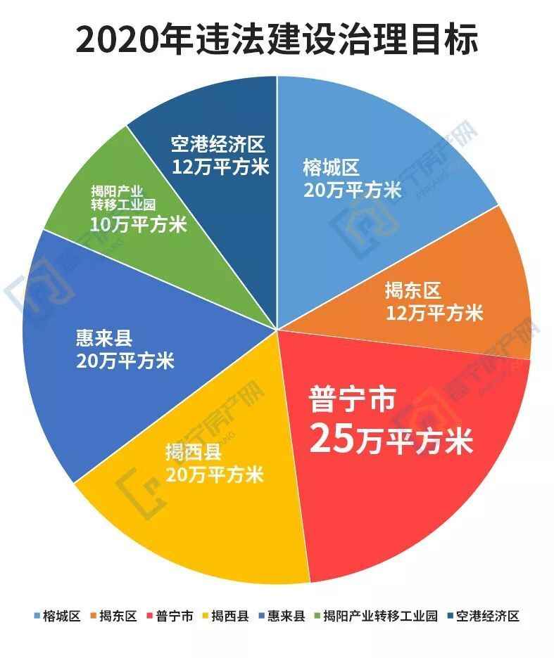 为深入贯彻落实关于违法建设治理的决策部署,坚决打好揭阳市违法建设治理攻坚仗,经市委、市政府同意,出台了《关于打好违法建设治理攻坚仗的实施意见》。其中提到,2020年普宁市违建治理目标为25万平方米。