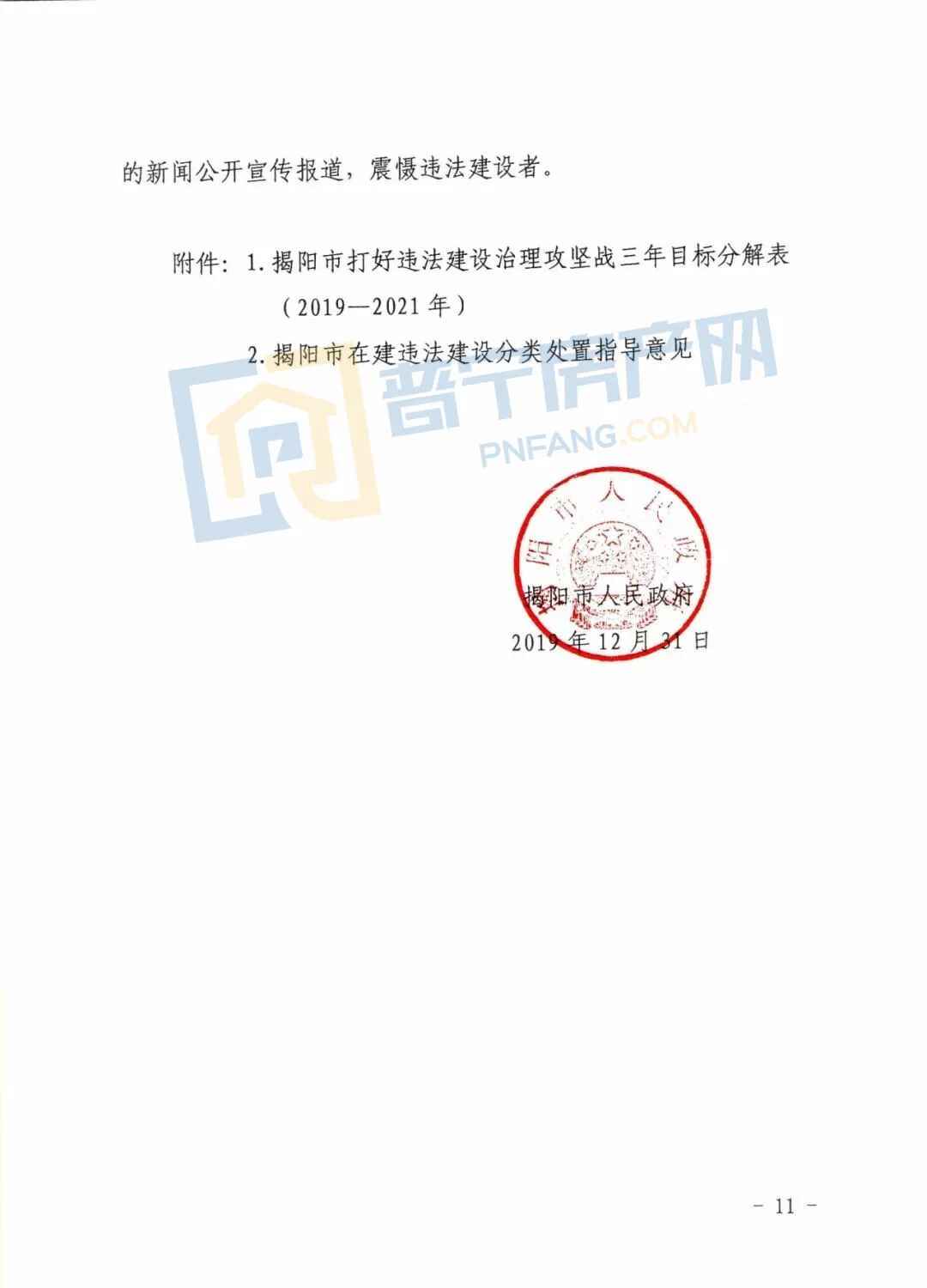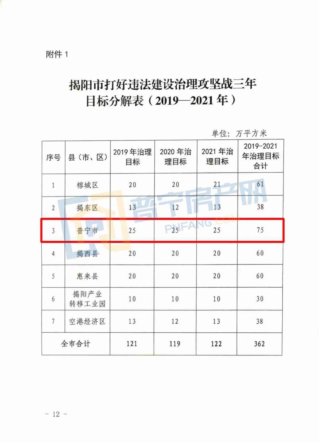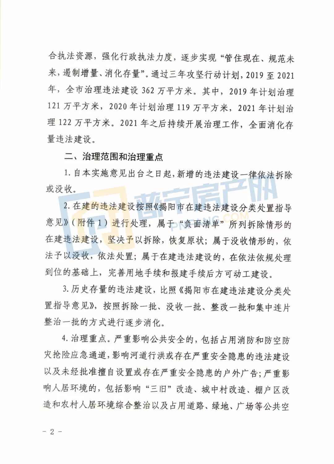 1. 通过三年攻坚行动计划,2019至2021年,揭阳全市治理违法建设362万平方米。其中,2019年计划治理121万平方米,2020年计划治理119万平方米,2021年计划治理122万平方米。2021年之后持续开展治理工作,全面消化存量违法建设。