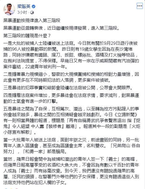 梁振英表示,黑暴运动已经进入第三阶段,大批的被捕者陆续被送上法庭;会有更多在不同时期犯法的人落网,更多案件被侦破;暴徒的犯罪事实和细节会陆续在法庭被公开,公众会大开眼界;更多暴徒会在法庭求情,要求减刑,进一步打击黑暴运动的士气;暴徒之间为了自保,互相笃灰(揭发)、潜逃,以至转为控方污点证人的事例会越来越多,暴徒之间的互相猜疑会越来越剧烈。他强调,所谓“兄弟爬山各自努力”,“和勇一家”都是骗局。