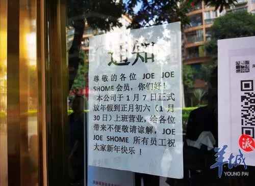 8日上午,记者在位于骏景路57号的“JoeJoe's Home”店址看到,该店已经关门停业,玻璃门内所贴告示显示:尊敬的各位会员,本公司于1月7日正式放年假到正月初六(1月30日)上班营业,给各位带来不便敬请谅解。