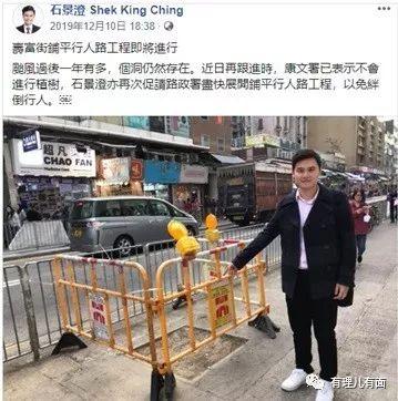 石景澄身为新当选的元朗区“素人”议员,自然积极工作,2019年12月10日在脸书上促请路政署尽快展开铺平行人路工程,以免绊倒行人。表面看起来还是挺尽职尽责的。