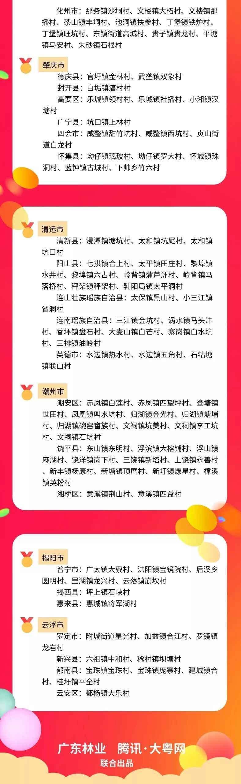 饶平县:东山镇东明村,浮滨镇大榕铺村,浮山镇麻湖村,饶洋镇岗下村,三饶镇新塔村,上饶镇永善村,所成镇高埕村,新丰镇杨康村,新塘镇顶厝村,新圩镇燎星村,樟溪镇英粉村。