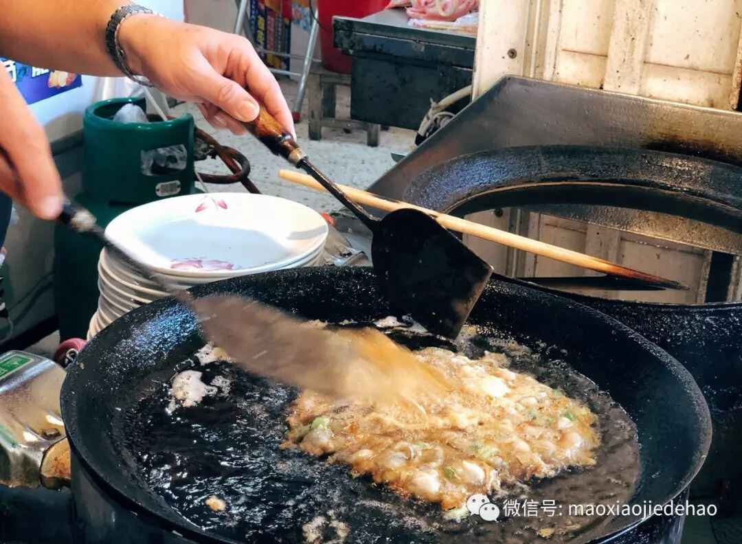 围观老板制作蚝烙的整个过程,就像在欣赏一门精湛的手艺。 倒入面浆,打入鸡蛋,和蚝仔一起拌匀,下油锅,不断地用油去浇在蚝烙上面,熟透后仔细沥干油份,才盛到碗里给你。