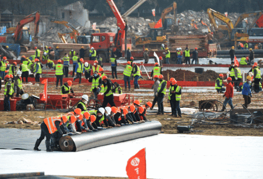 火神山医院项目现场建设快速推进,现场有近700名管理人员、4000余名工人(两班倒)、各类大型机械设备及运输车辆等近千台,24小时轮班作业投入医院建设战斗。
