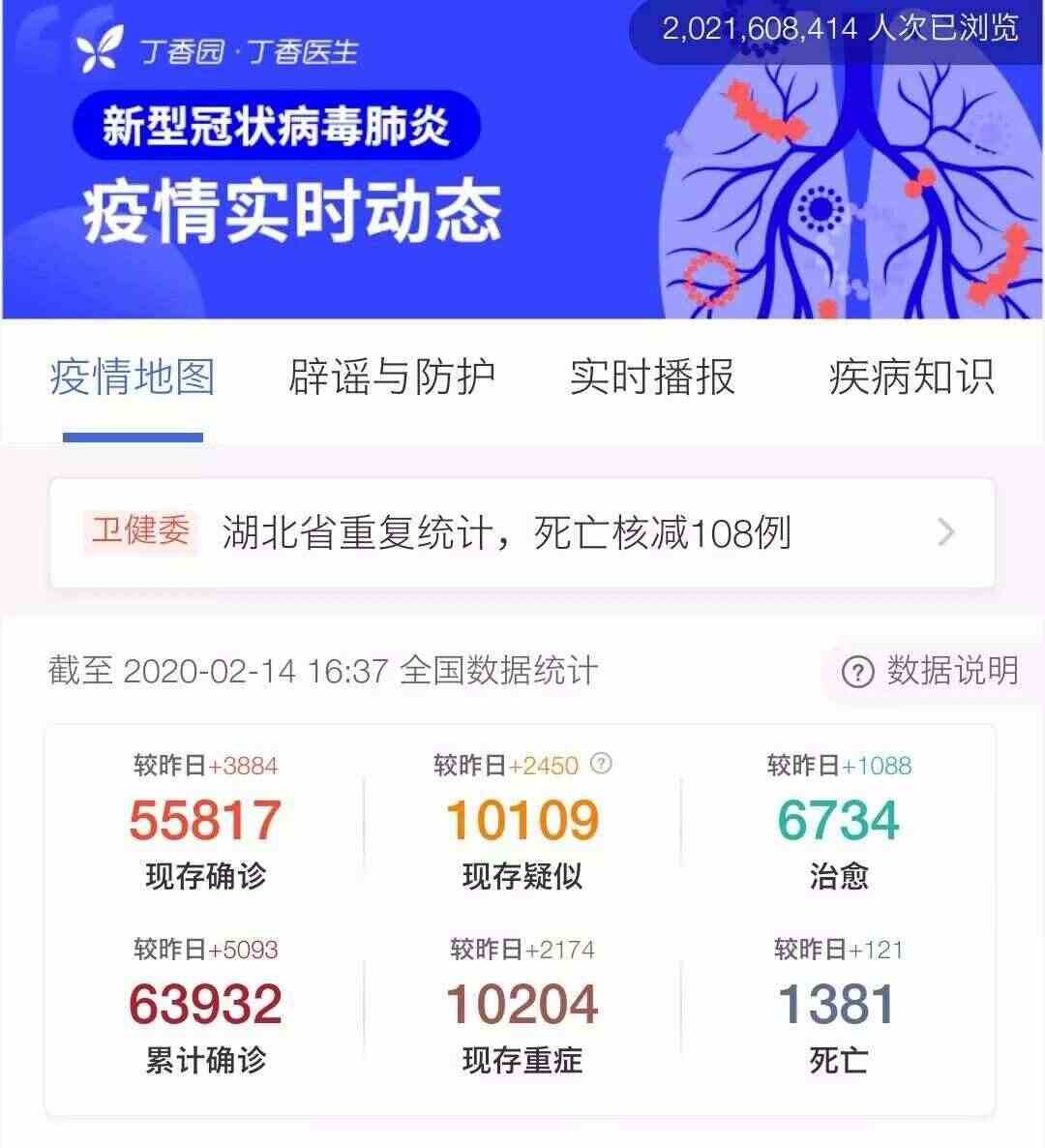 截止到2020年2月14日16点37分(新西兰时间),全国确诊病例63932,死亡1381。