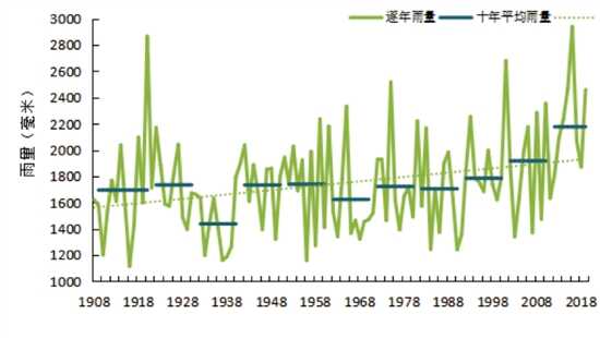 上图是广州年雨量随时间的变化,虽然不如气温变化趋势那么明显,但同样具有增多的趋势。广州近百年雨量增加的速度是32.2毫米/10年,也即是说现在年雨量比20世纪初要多300多毫米,最近十年广州平均年雨量达到2193.8毫米,是雨量最多的时期。