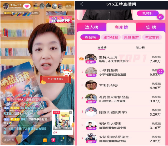 此次515王牌直播间活动,王芳老师直播间全程福利不断。不仅有半价折扣,还有超值低价,更上架了签名版的个人作品《穿过历史线,吃透小古文》,满足直播间粉丝的期待。直播间内的限量图书、低价秒杀、抽奖送书等福利活动也激发了粉丝们的购书热情,多款图书很快被售空告罄。这场高人气直播也让王芳老师在开播两小时后登上商家榜综合榜第一名,可谓成绩斐然。