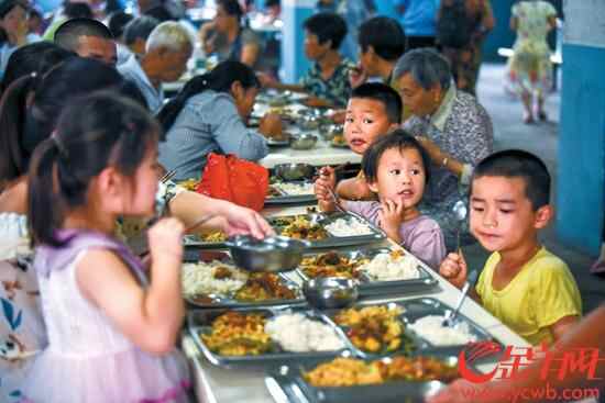 14日,在江西鄱阳县油墩街镇受灾群众安置点——油墩街镇中学饭堂里,受灾群众和小朋友吃上热乎乎的饭菜 羊城晚报特派江西记者 宋金峪 摄
