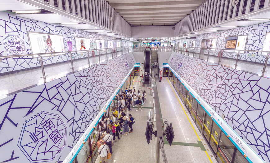 广州地铁历来重视岭南文化的传播。例如南沙客运港站、南海神庙站、广州北站和知识城站等四个极具地标性意义的车站,分别采用了醒狮、海上丝绸之路等元素,打造为岭南文化主题站。此外,还推出了“搭地铁赏国学”、粤剧、广彩、广府庙会等特色主题站、主题列车,让乘客在搭乘地铁的同时品味岭南文化的传统韵味,感受非遗风采。