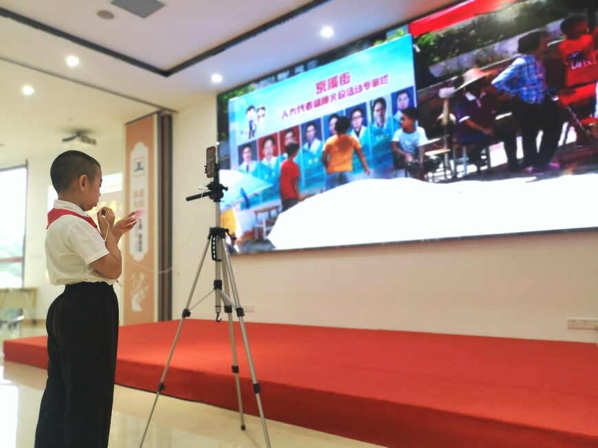 “三门村的小伙伴们,很开心能与您线上聊天,分享你们实现微心愿的快乐。”广州市白云区京溪小学学生谢可儿在京溪街党群服务中心通过直播镜头与英德市三门村小学学生开展对话。