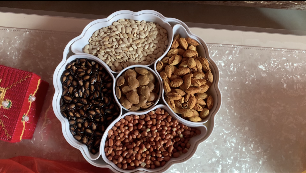 马银成家餐桌上的坚果。新华社记者 罗毓 摄