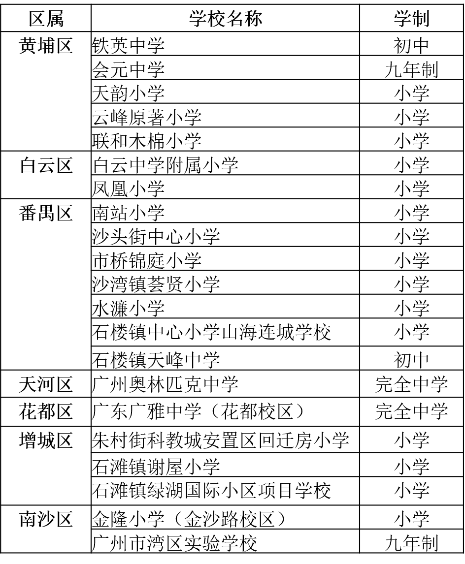 番禺区新办6所小学,南站小学、沙头中心小学、市桥锦庭小学、沙湾镇荟贤小学、水濂小学、石楼镇中心小学山海连城学校;1所初中,石楼镇天峰中学。