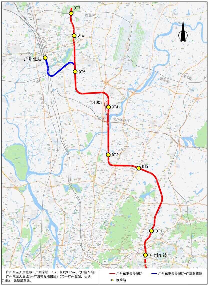 广州东至花都天贵城际,与芳村至白云机场城际共同组成广州市中心南北向高速、快速双通道,上接铁网,在湾区内形成高速、快速双通道;下连市网,衔接沿线城市轨道交通线网,实现城际的公交化运营。