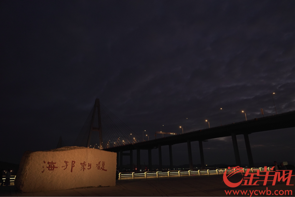 图为夕阳下的汕头市西堤公园,石碑上刻着“海邦剩馥”四字
