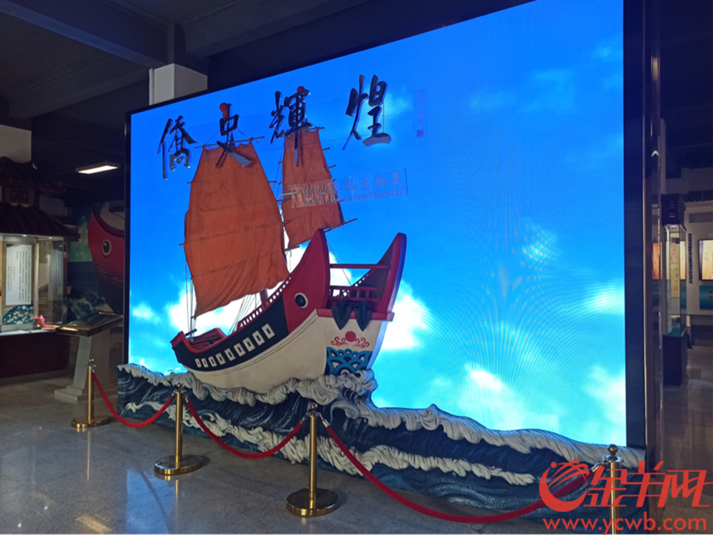 图为汕头市侨批文物馆正门标志性建筑,一艘红头船正扬帆起航