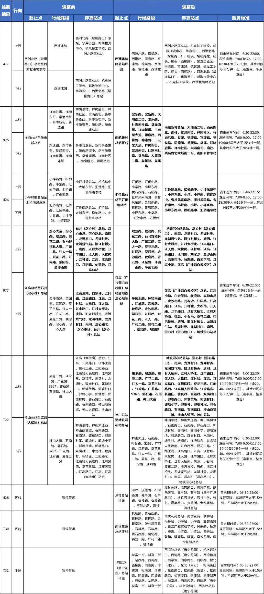 线路调整中,477路起止站点由西洲北路(增槎路口)总站至西洲北路尾总站,变更为西洲北路尾总站环线;925路起止站点由祥岗总站至新市墟总站,变更为南航新村总站环线;426路起止站点由小坪村委总站至汇侨南路总站,变更为汇侨路总站环线;977路起止站点由江高总站至石井(滘心村)总站,变更为江高(广技师白云校区)总站至地铁滘心站总站;722路起止站点由神山总站至江高(大松岗)总站,变更为神山总站至地铁滘心站总站。