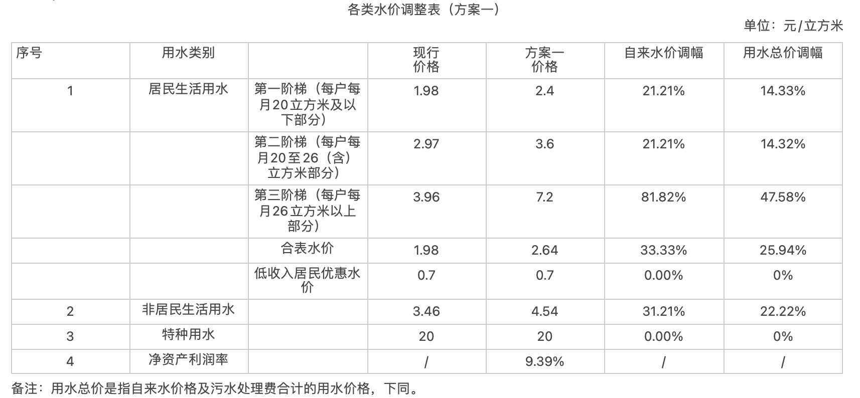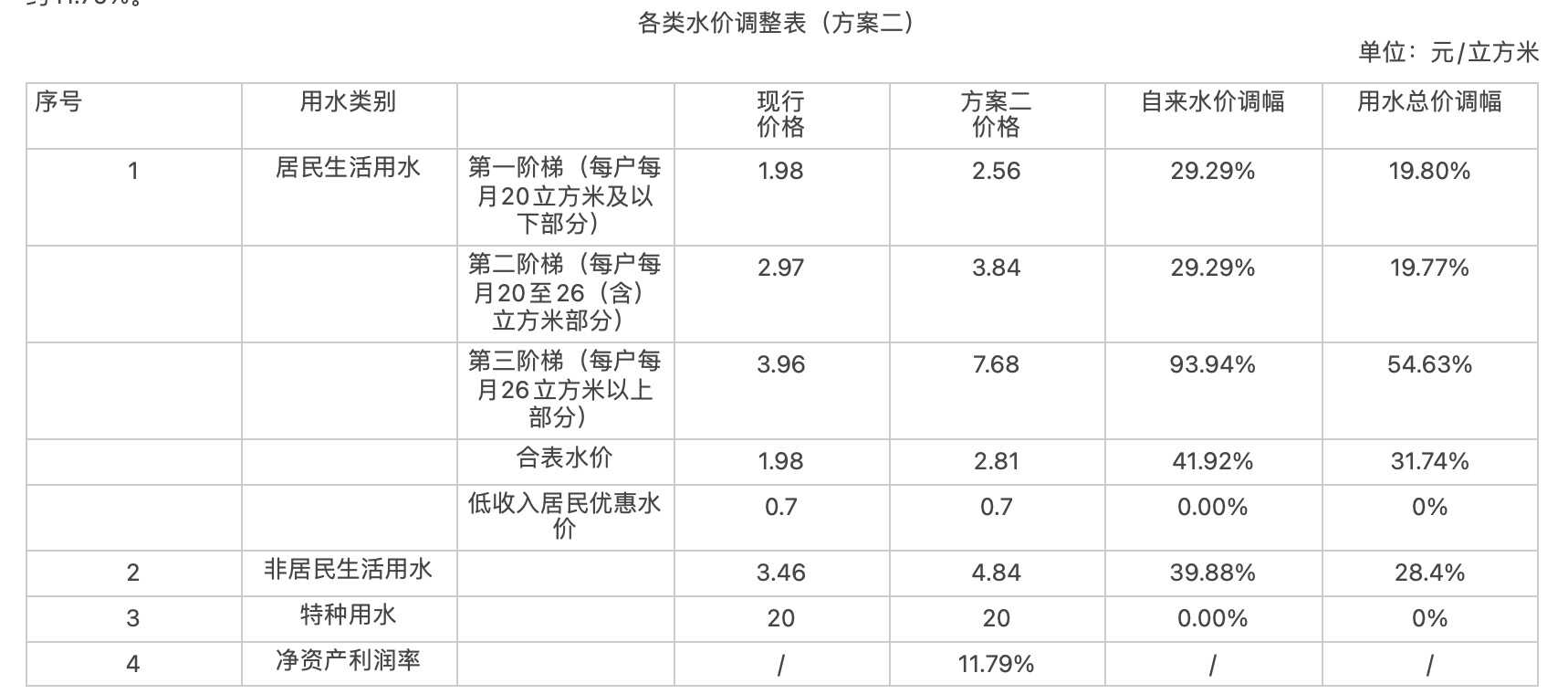 居民生活用水三个阶梯水价标准分别为2.4元/立方米、3.6元/立方米、7.2元/立方米;新设居民合表水价标准为2.64元/立方米,分别比现行价格涨21.21%、21.21%、81.82%;低收入居民优惠水价维持0.7元/立方米不变;非居民生活用水收费标准调整为4.54元/立方米,比现行价格涨31.21%,特种用水价格维持20元/立方米。净资产利润率约9.39%。