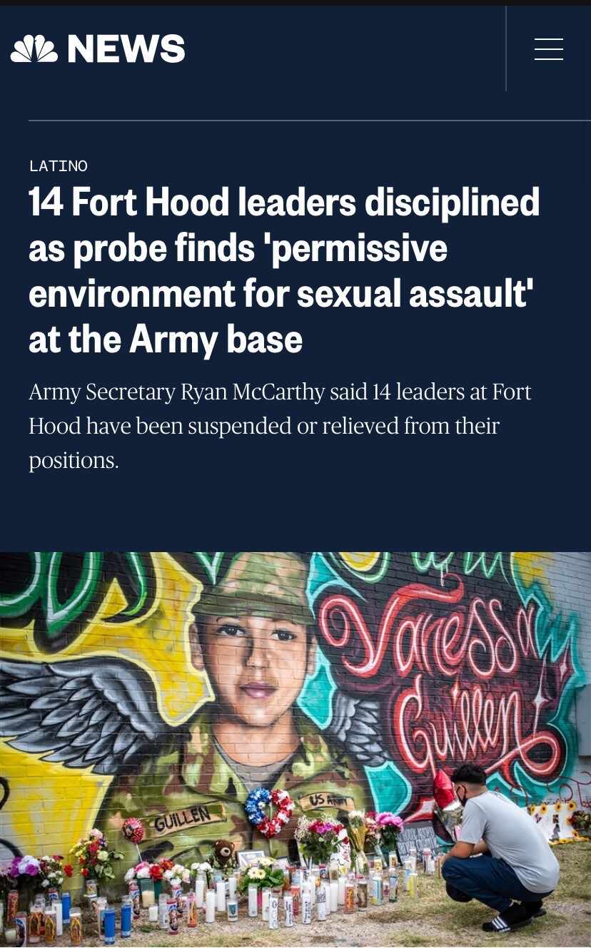 △美国广播公司报道,14名胡德堡陆军基地官员因长期纵容性侵和性骚扰行为而被处分