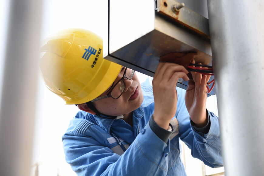 运维人员头戴“定位安全帽”,手持便携式北斗定位终端开展现场工作 丘映丹 摄