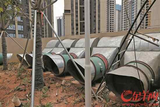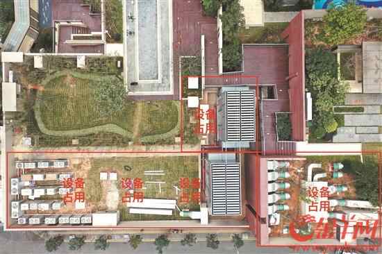 1月11日,羊城晚报记者在正大城一期北区看到,该空中花园共有三层,第二层一处空旷的草坪被一排竹子隔开,竹子的另一边,5排大型空调外机一字排开,每排空调机数量从4台至7台不等,一些零零散散的钢管堆放在绿地上,占用绿地面积超过100平方米。另一侧,两台大型冷却塔足有一层楼高,占用绿地面积约100平方米。记者来到空中花园的第三层,首先映入眼帘的同样是各种大型设备,有口径约60厘米的通风机,还有一根数米长的管道布设在草地里,该层各种设备占地面积也近百平方米。记者估算,该小区北区花园共有6处大型设备占据花园面积较大,零散设备随处可见,各种设备总计占据的花园面积约400平方米。