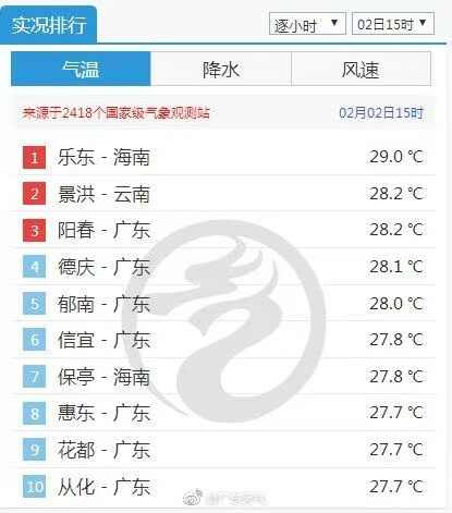 2月2日15时,广东多地气温“暖”进全国前10 新浪微博“@广东天气”截图